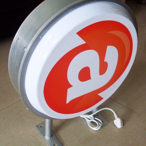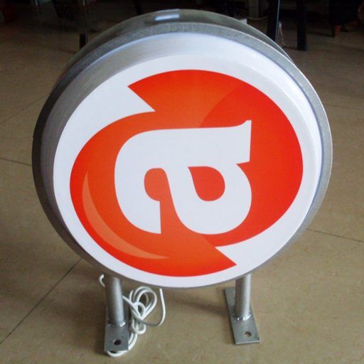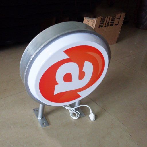 This Sign a is in double-sided light box with acrylic face and brushed stainless steel shell, sized in 30 inches tall by 30 inches wide. It’s installed on the wall with bracket on the side.