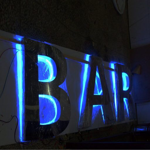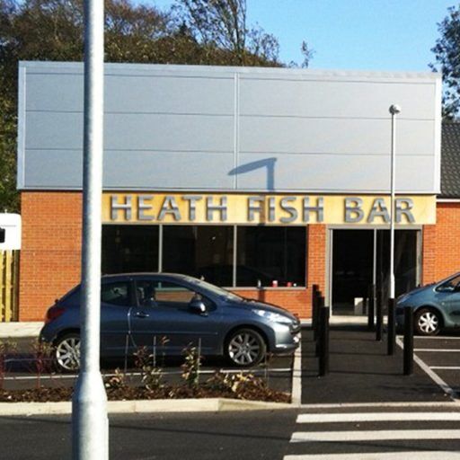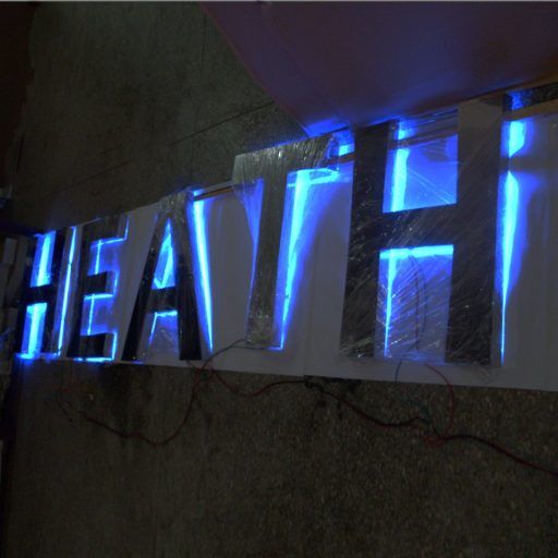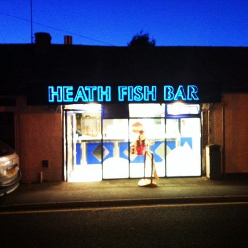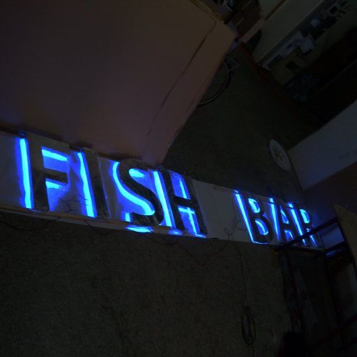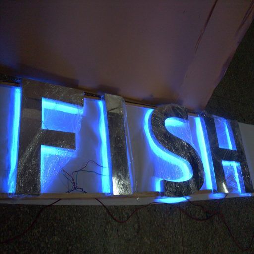 This Sign HEATH FISH BAR is in blue led halo backlit with mirror polished stainless steel face and mirror polished stainless steel return, sized in 24.5 inches tall by 340 inches wide. It is a sign for fish bar business.