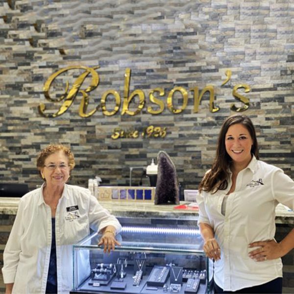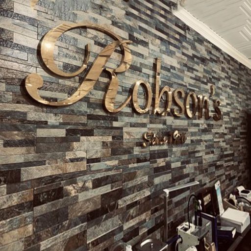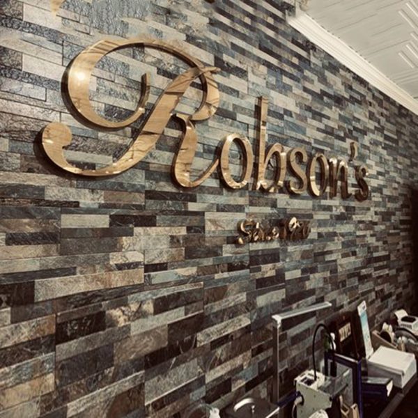 This Sign Robson’s is in non-light channel letters with titanium gold stainless steel shell, sized in 18 inches tall by 65 inches wide.