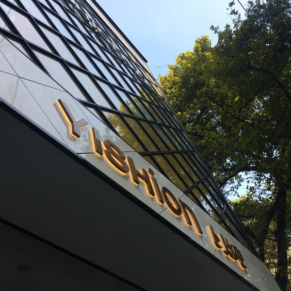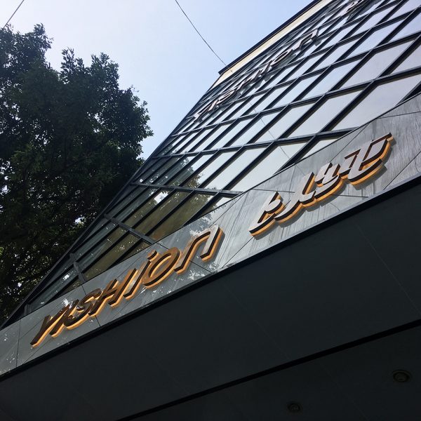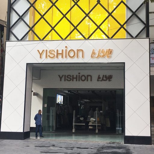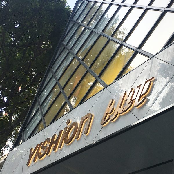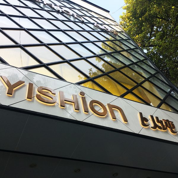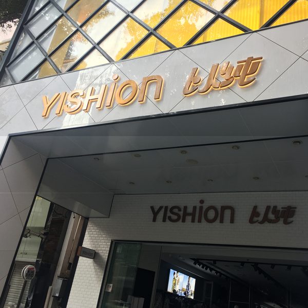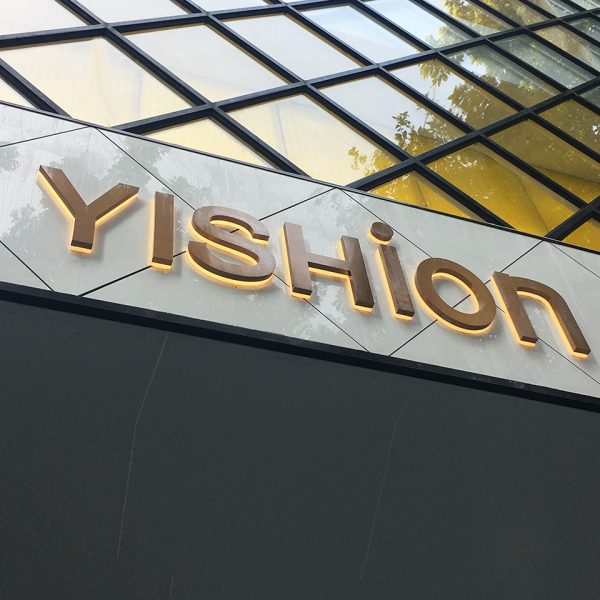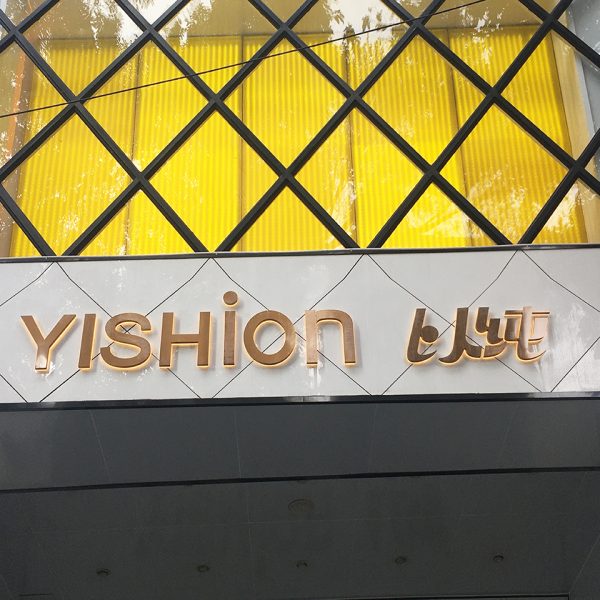This Sign YISHION is in yellow led sidelit with titanium gold stainless steel front panel and frosted acrylic back base, sized in 12 inches tall by 65 inches wide.